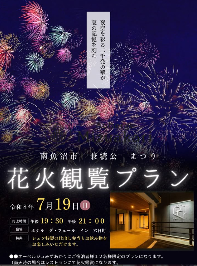 オーベルジュみずあかりの姉妹店のホテル 「ダ・フェールイン六日町」で花火を見ながら美味しいお弁当付きの特別プランです😊✨